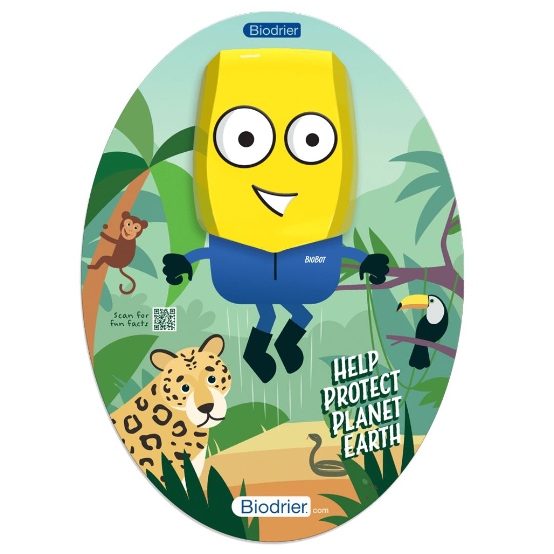 Built with the energy efficiency of the 3D Smart Dry it's not only sleek in design but also remarkably quiet at 65 dba. Biobot 2 maintains high performance without compromising on aesthetics. It boosts the decor of a washroom designed for children with a jungle-themed splashback and bright yellow casing.