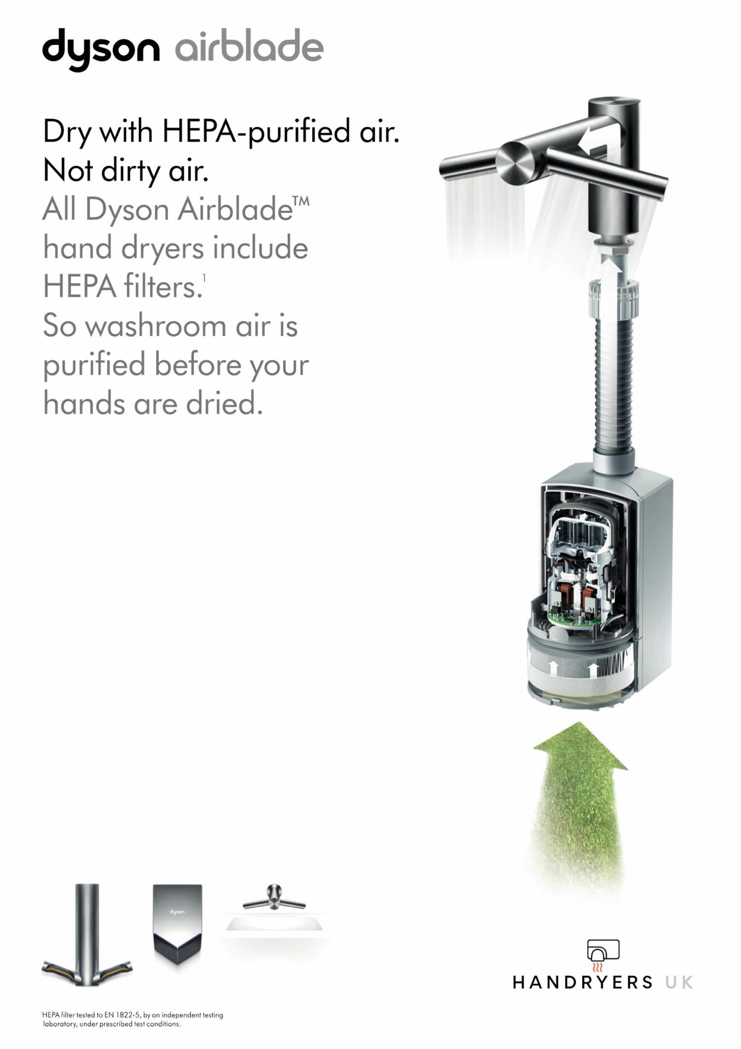 The HEPA filter captures 99.95% of particles up to 0.3 microns from the washroom air, before it's blown on to hands.