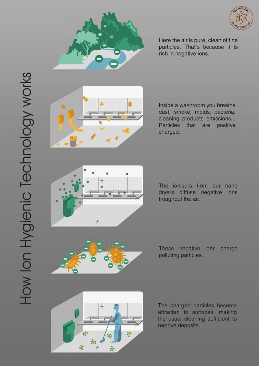 This unit incorporates an ionizer ("Ion Hygienic" technology) that constantly cleans and purifies the air in the washroom through the emission of anions, eliminating most of the germs and particles transported through the air, helping it to be purer and healthier. (See images for further explanation)