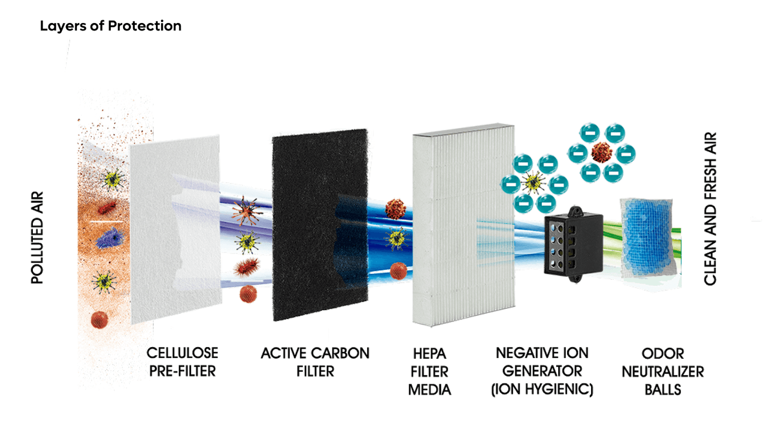 HEPA filter as standard which includes a pre layer and carbon filter to make sure it catches 99.9% bacteria from the air before it's blown on the hands