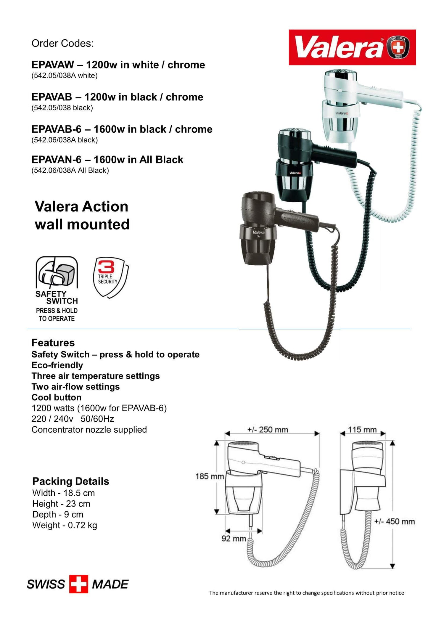 The Valera Action Hand Held Hair Dryer has been designed for individual use at hotels or similar locations. It is powerful yet eco-friendly and easy to operate. The unit is highly adjustable with multiple settings available. Push button operation prevents unintended use.
