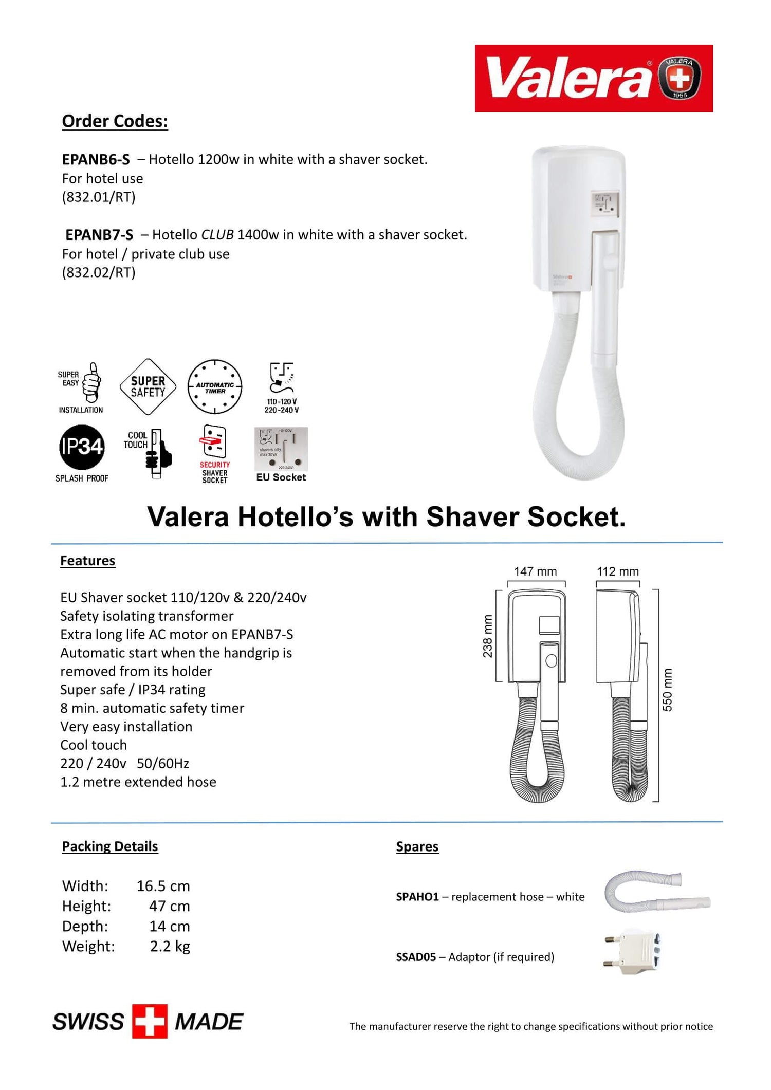 Valera Hotello Hair Dryer with Shaver Socket IP34 1200W - EPANB6-S is backordered and will ship as soon as it is back in stock.