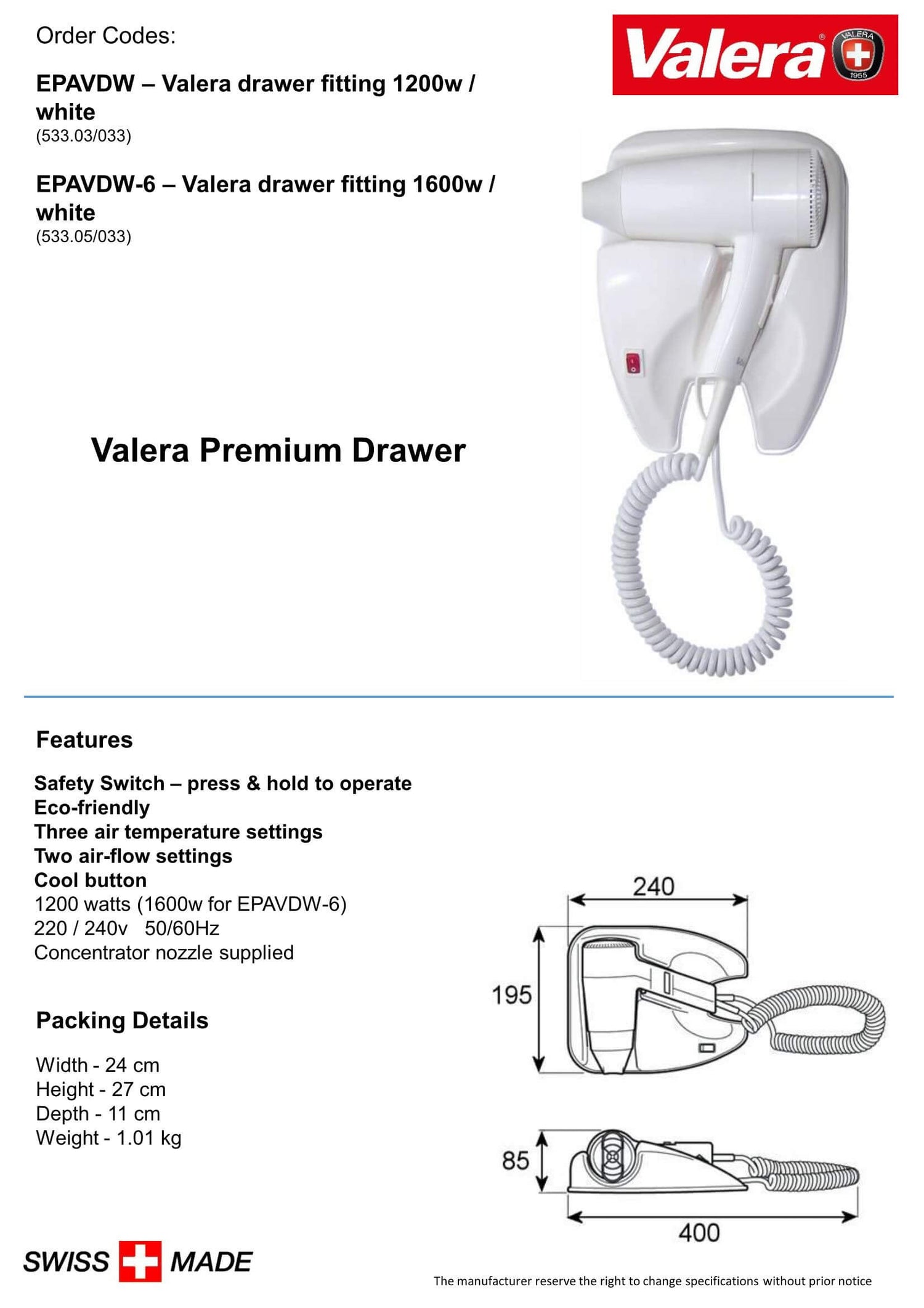 Valera Premium Drawer Mounted Hair Dryer 1200W - EPAVDW is backordered and will ship as soon as it is back in stock.